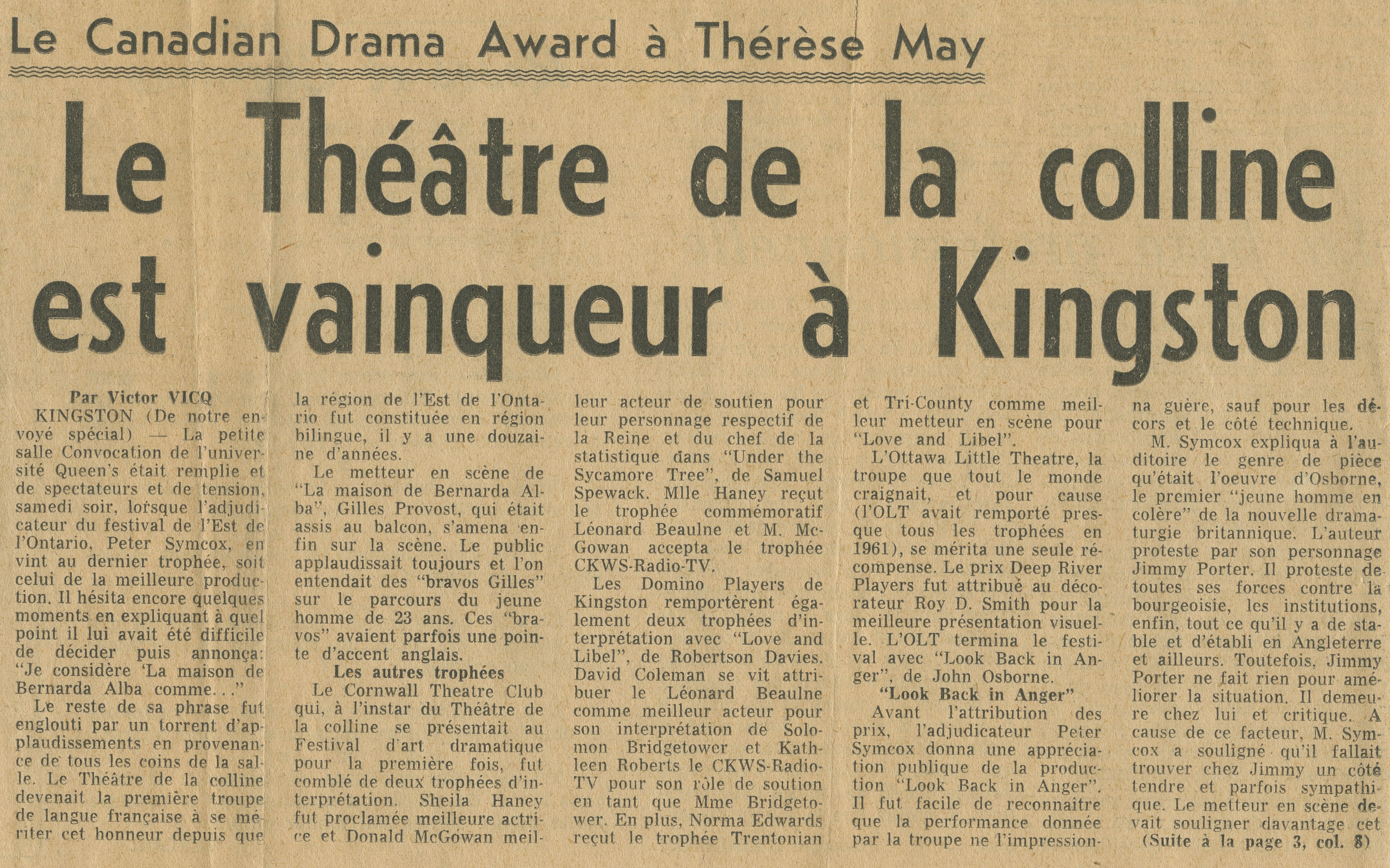 « Le Théâtre de la Colline est vainqueur à Kingston », Le Droit, p.1