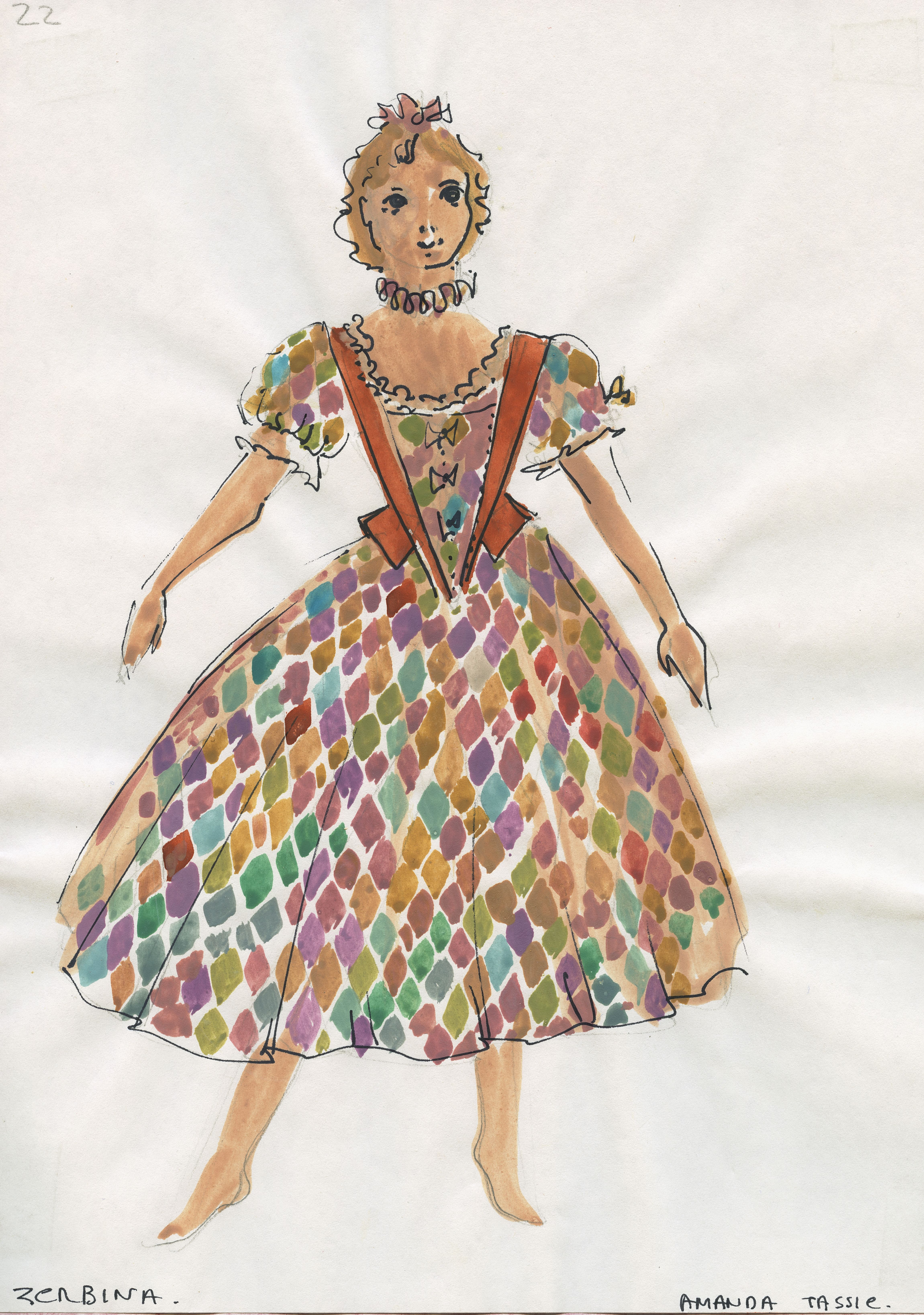 Croquis du costume de Zerbina, interprétée par Amanda Tassie, dans la pièce Le capitaine Fracasse, Gilles Lalonde (concepteur)