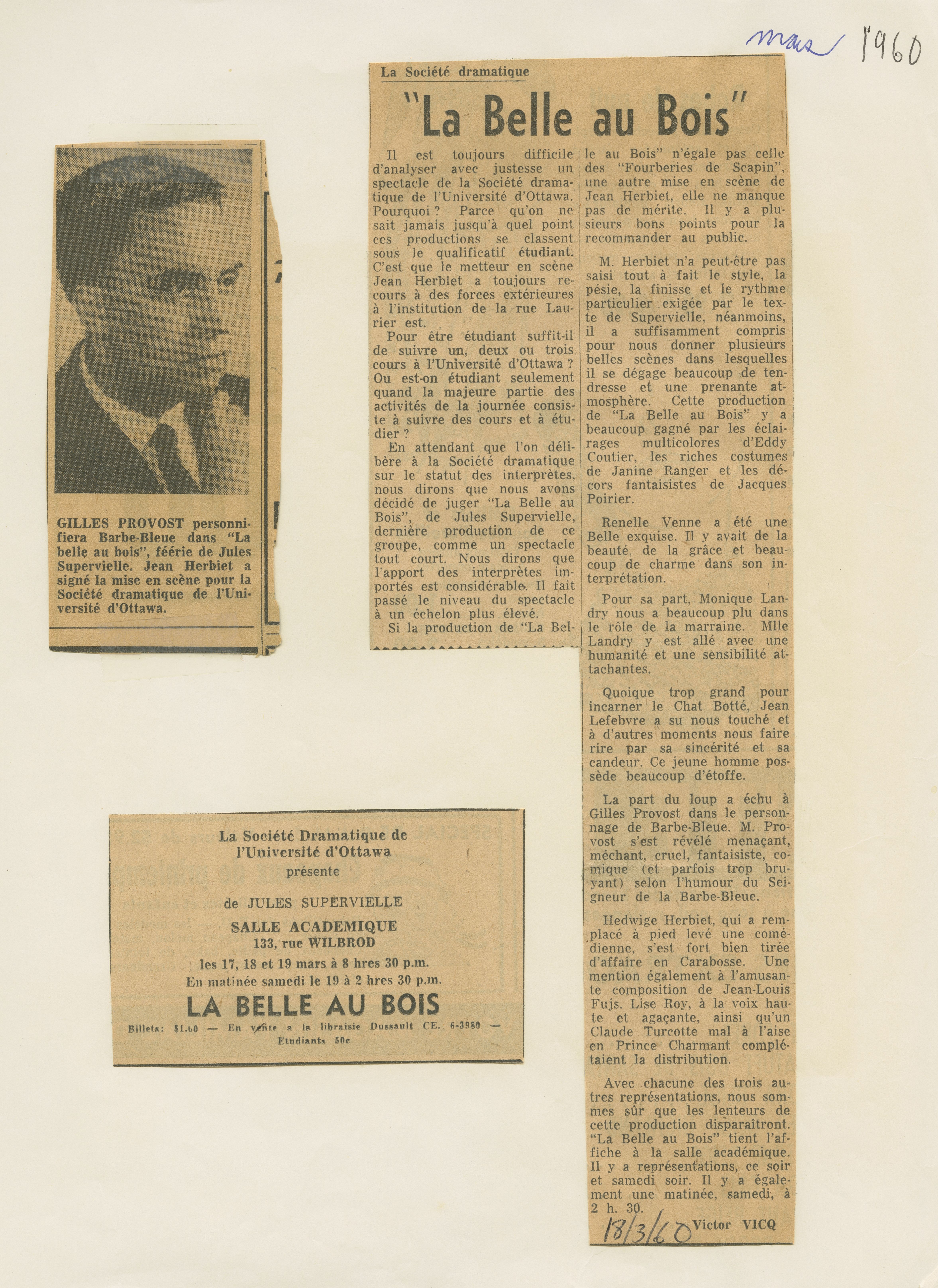 Publicité et article de presse du journal Le Droit concernant la pièce La belle au bois de Jules Supervielle