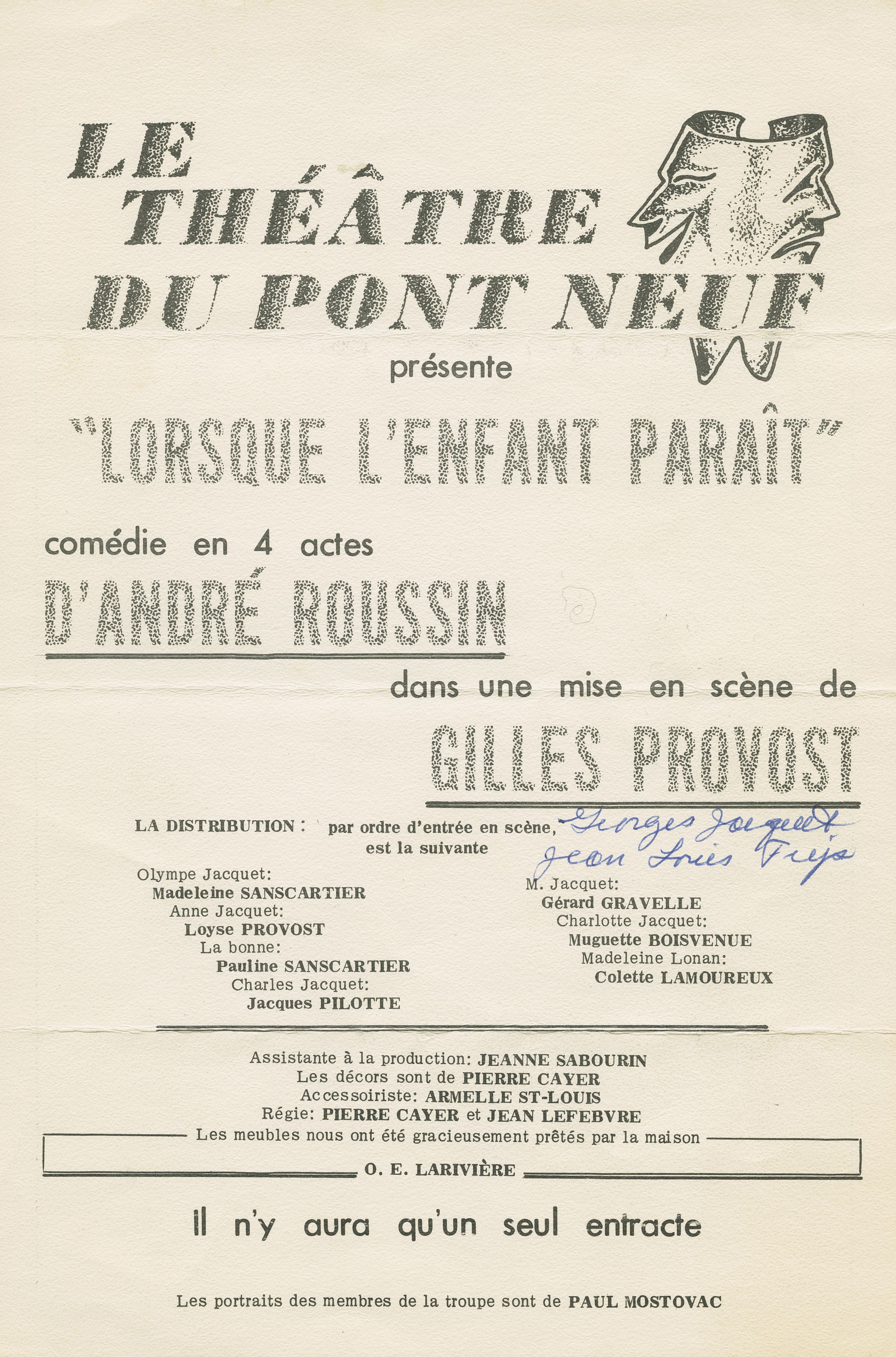 Programme de la pièce Lorsque l'enfant paraît d'André Roussin, mise en scène par Gilles Provost