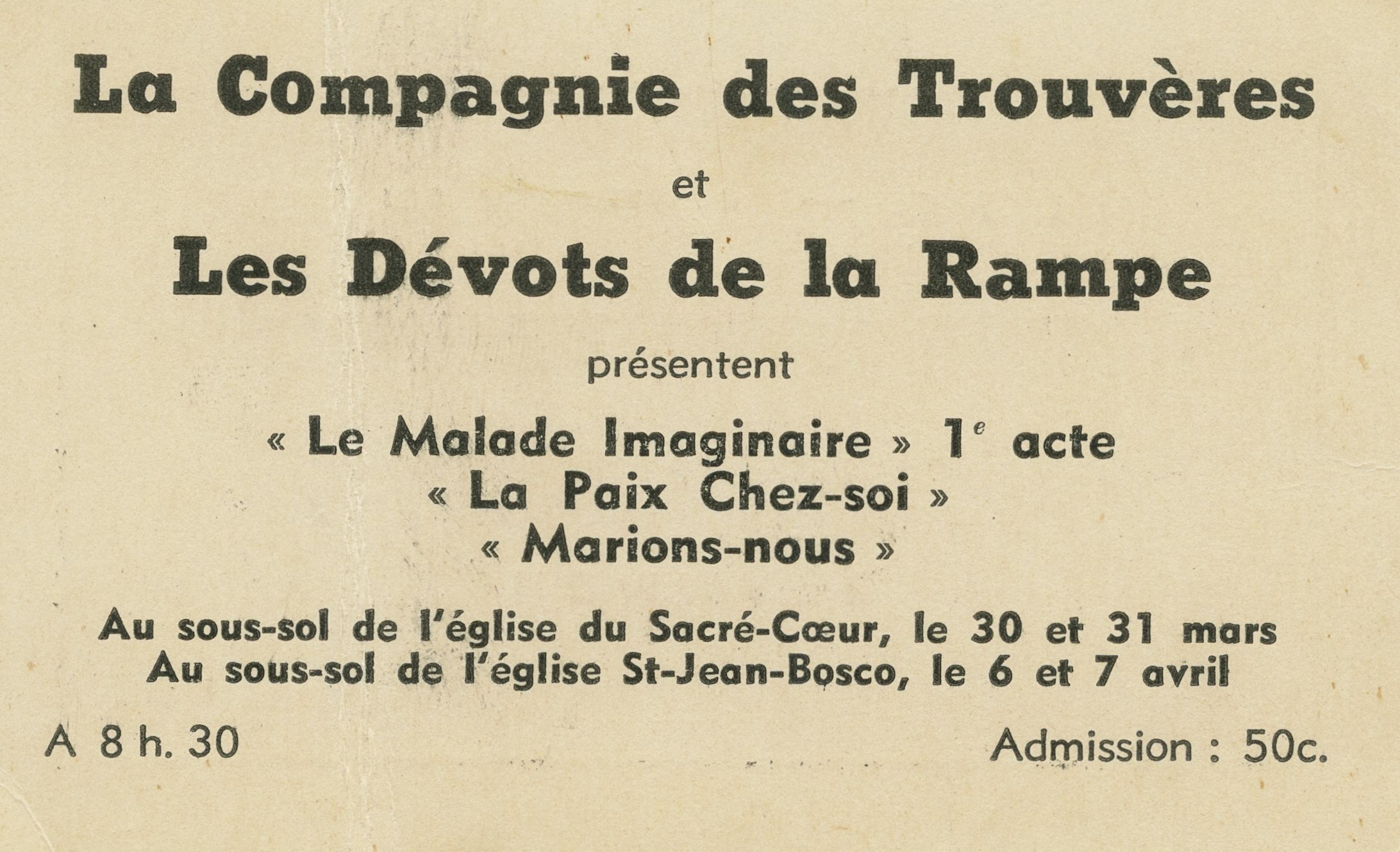 Matériel promotionnel pour les pièces Le malade imaginaire, La paix chez-soi et Marions-nous