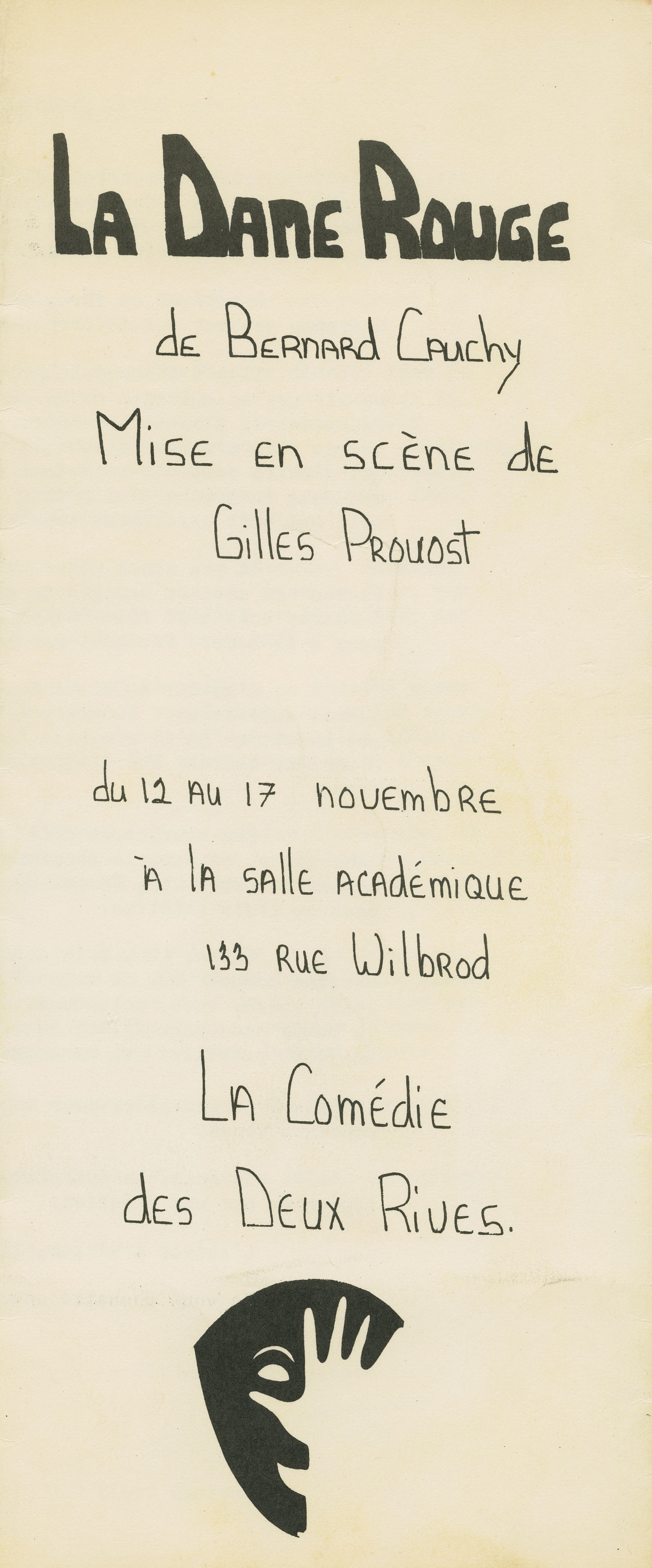 Programme de la pièce La dame rouge de Bernard Cauchy, mise en scène par Gilles Provost