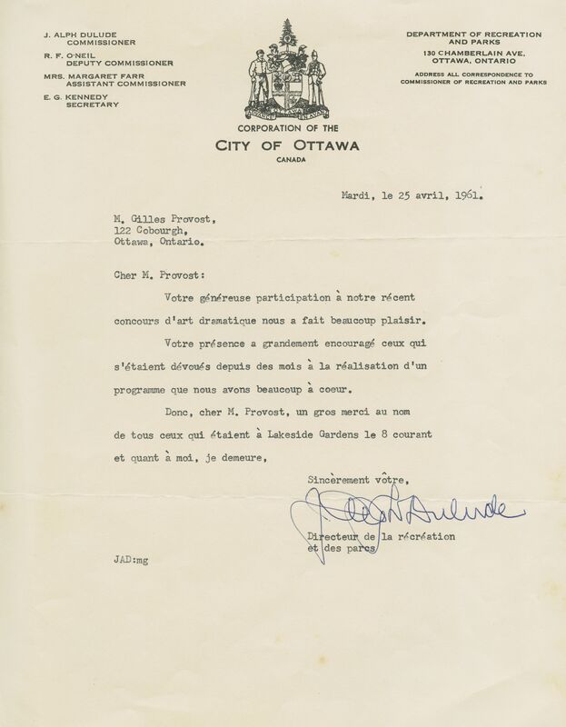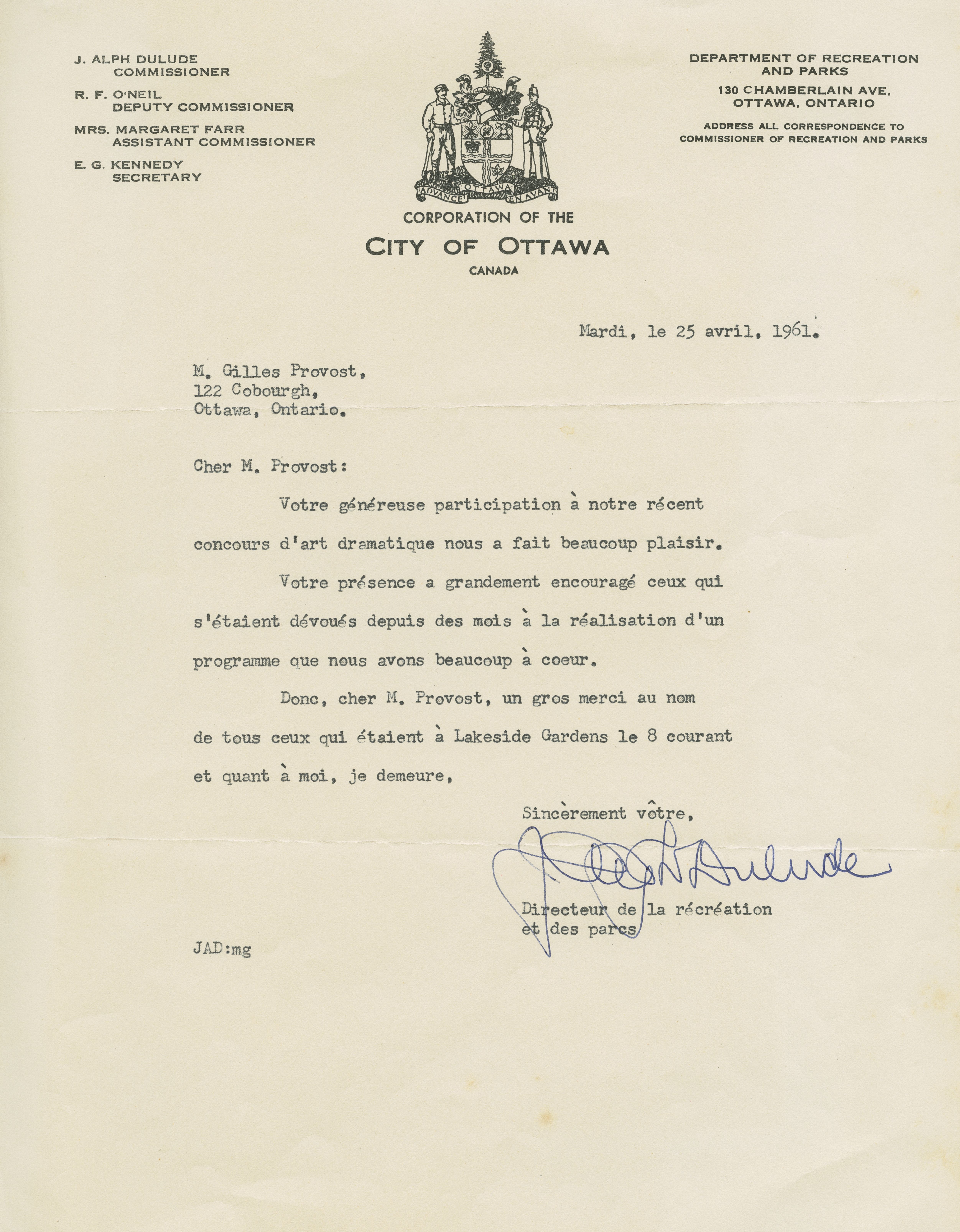 Lettre adressée à Gilles Provost de la part de Joseph Alphonse Dulude (directeur de la récréation et des parcs) à propos de sa participation au Concours d'art dramatique de Lakeside Gardens