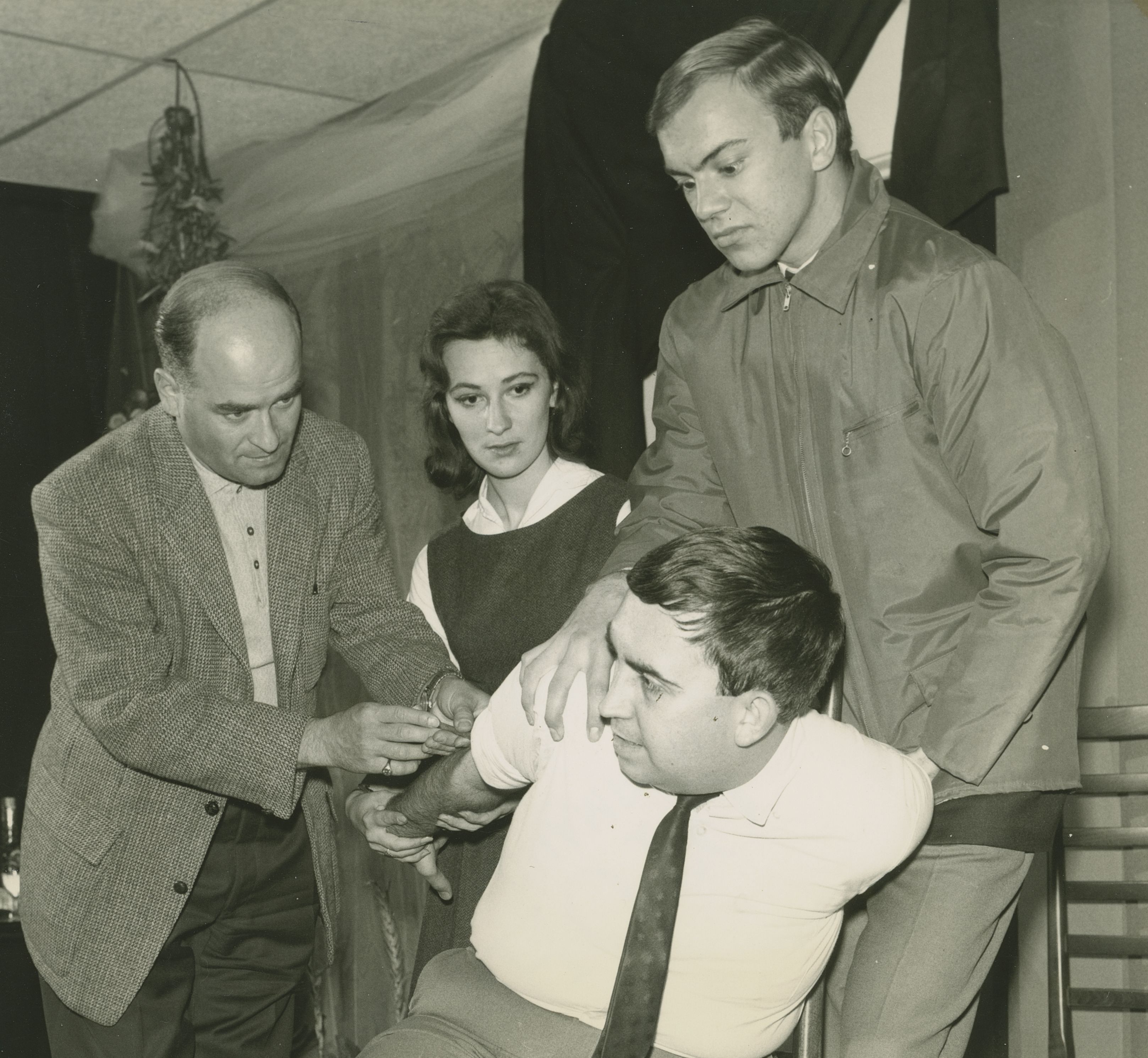 Gérard Anderson, Cécile Déziel, Gilles Provost et Yvon Leblanc dans la pièce Piège pour un homme seul de Robert Thomas