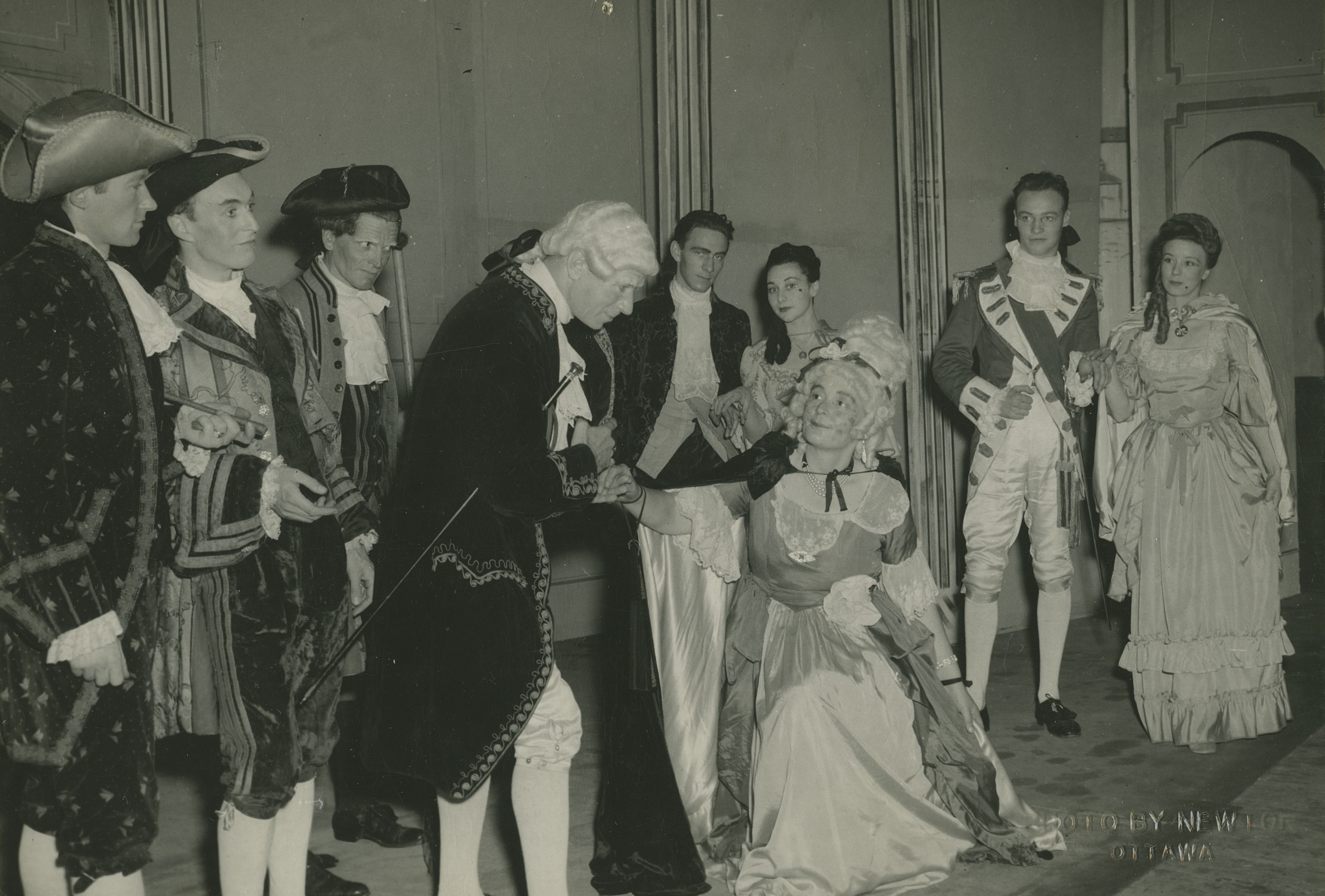 The Rivals, pièce présentée par The Stage Society. De gauche à droite : Floyd Caza, Richard Backley, Dale Macdonald, Jack Ammon, Christopher Plummer, Daphne Thompson, Ruth White, Derek Ralston, Betty Leighton