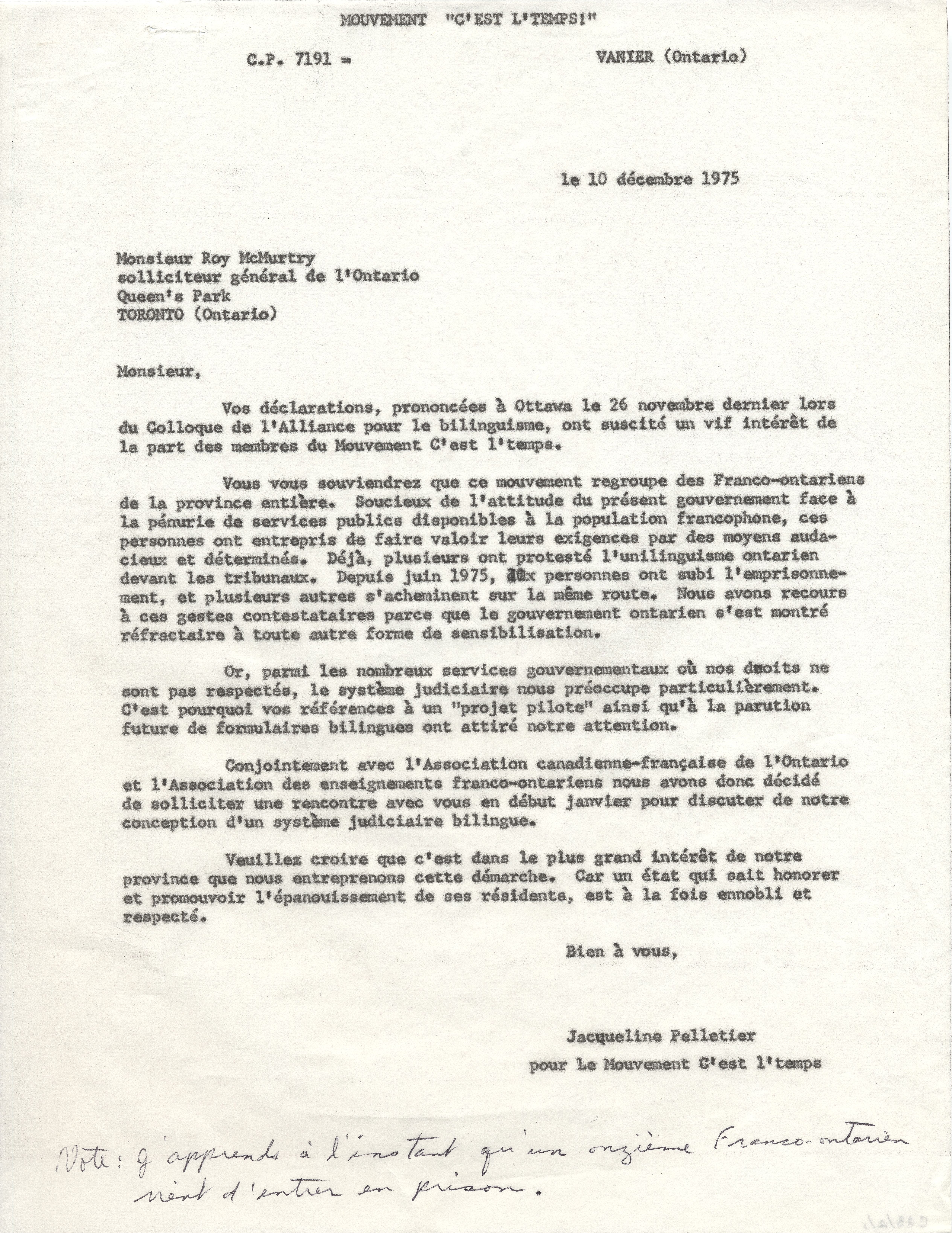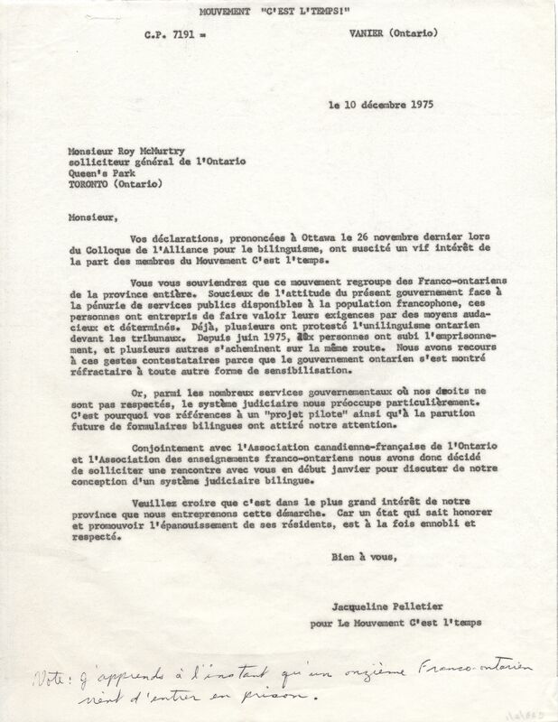 Lettre de Jacqueline Pelletier à Roy McMurtry, soliciteur général de l'Ontario