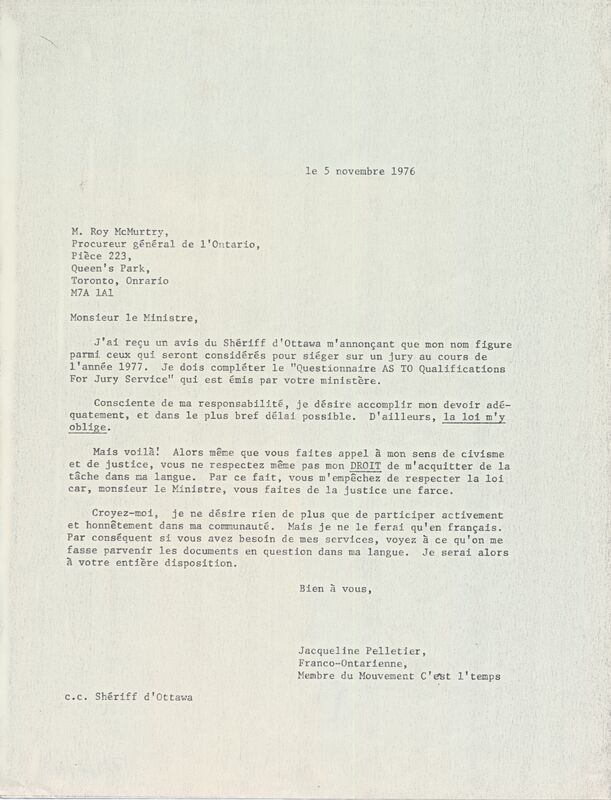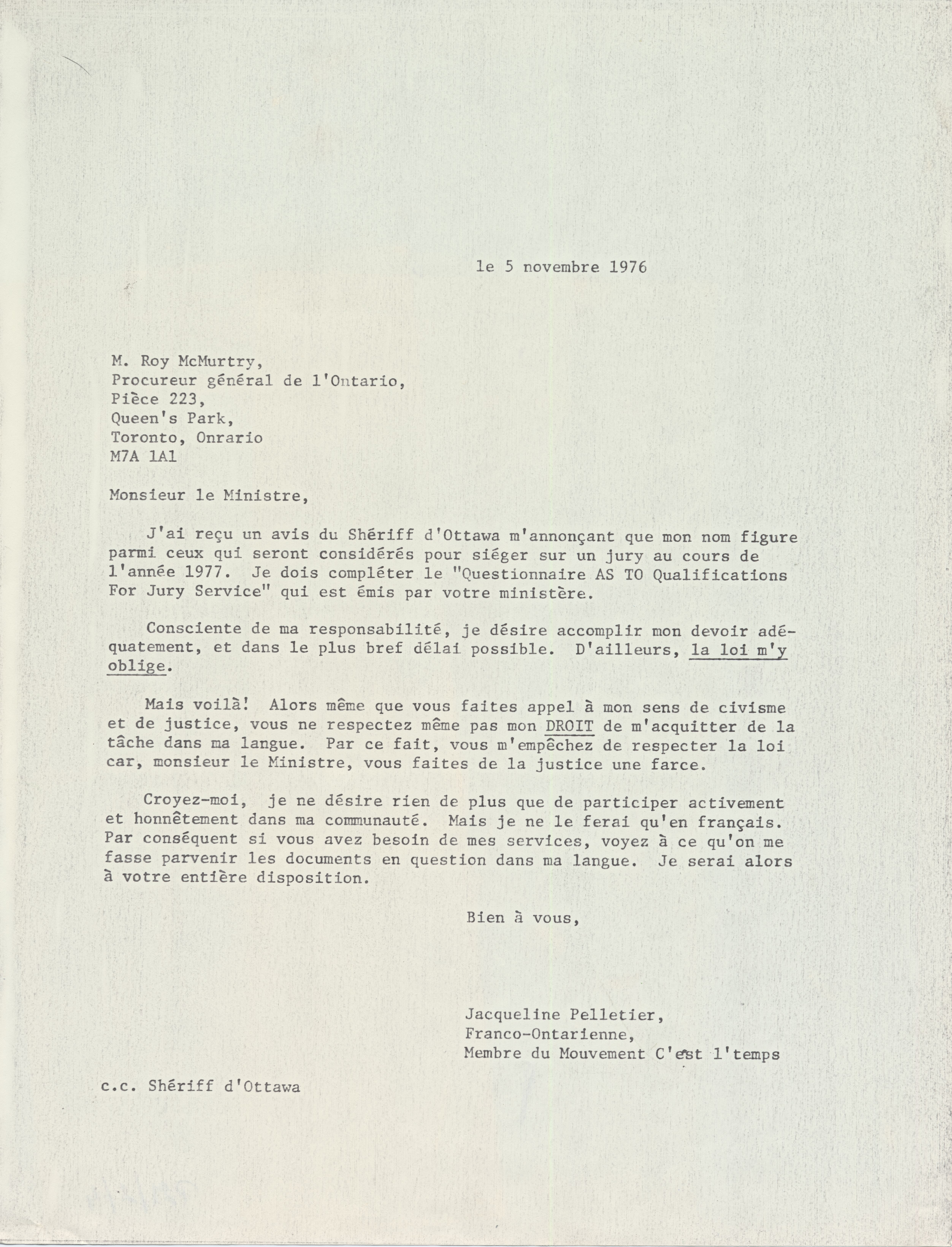 Lettre de Jacqueline Pelletier à Roy McMurtry, Procureur général de l'Ontario