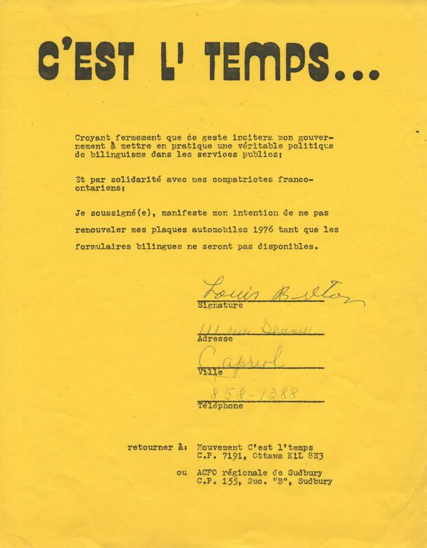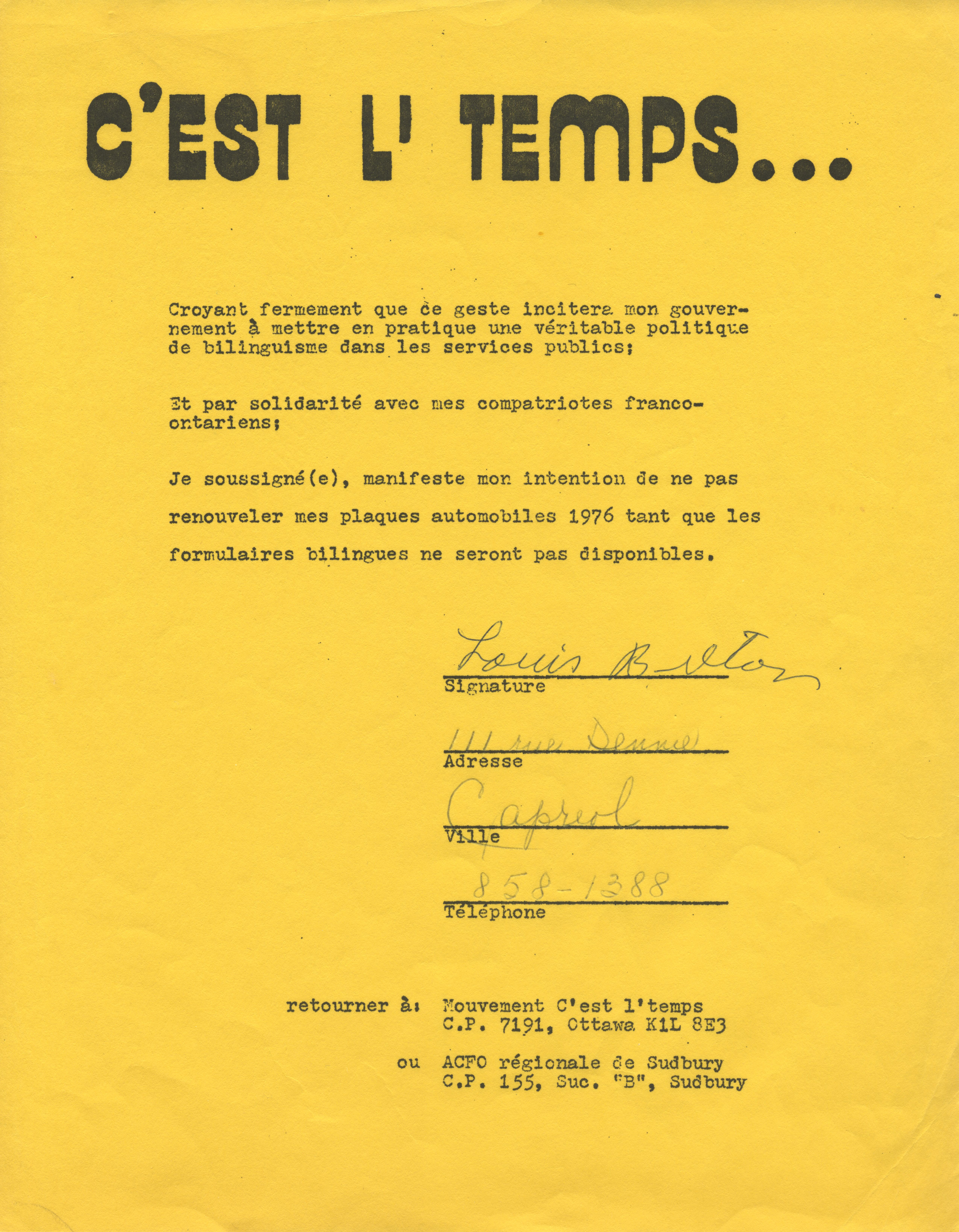 Formulaire du Mouvement C'est l'temps - signé par Louis Breton