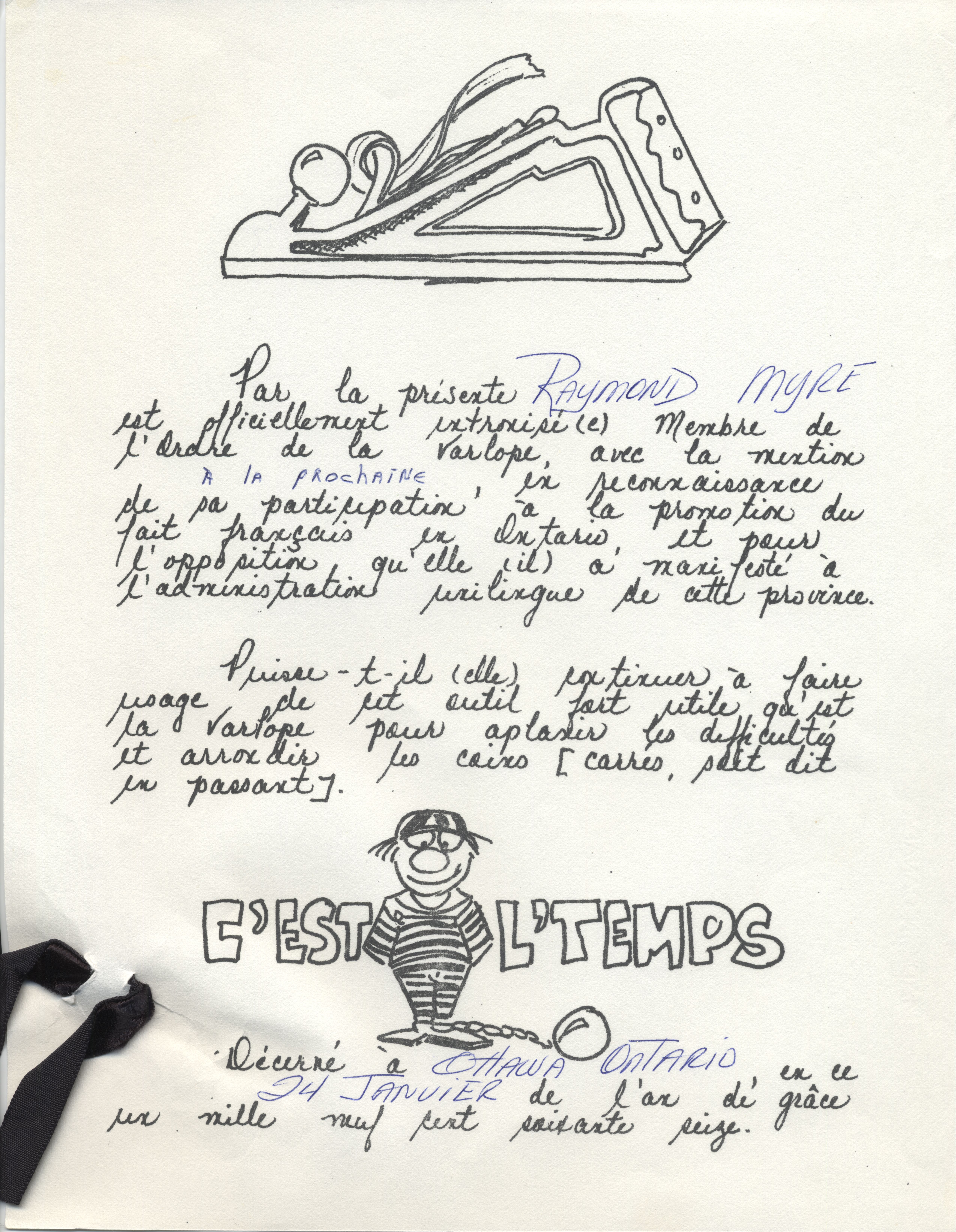 Certificat de membre de l'Ordre de la Varlope décerné à Raymond Myre